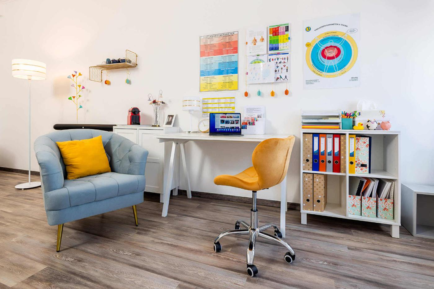 Ahogyan múltkor is, most is több szempontot figyelembe véve, az előírásnak megfelelően alakítottam ki a helyiséget, monst már az előbbinél nagyobb rutinnal. A tervezés során a legfőbb cél az volt, hogy a hely szolgálja az ide érkező páciensek lazulását, gyógyulását, és egyszerre munkaterülete a kezelő terapeutának. A tér ezúttal is könnyen kezelhető, átalakítható.