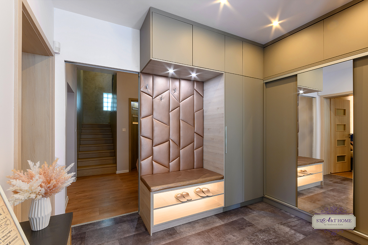 Az előszoba helyiséget teljesen újragondoltuk: egy új gipszkartonfallal kialakítottunk egy modern, letisztult előszobát. A mindent elnyelő és praktikusan kialakított előszobabútor tervét is minden centimétert figyelembe én készítettem.