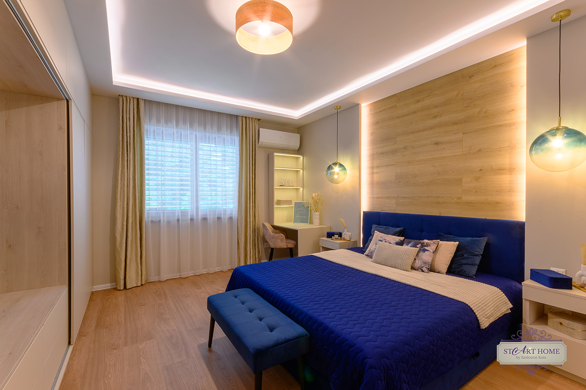 A vendégszoba kialakítása praktikus, mégis csodás, az idekerülő praktikus bútorba elhelyeztünk egy tv-t, illetve az ide tervezett egyedi bútor további tárolásra ad lehetőséget a megrendelőmnek.