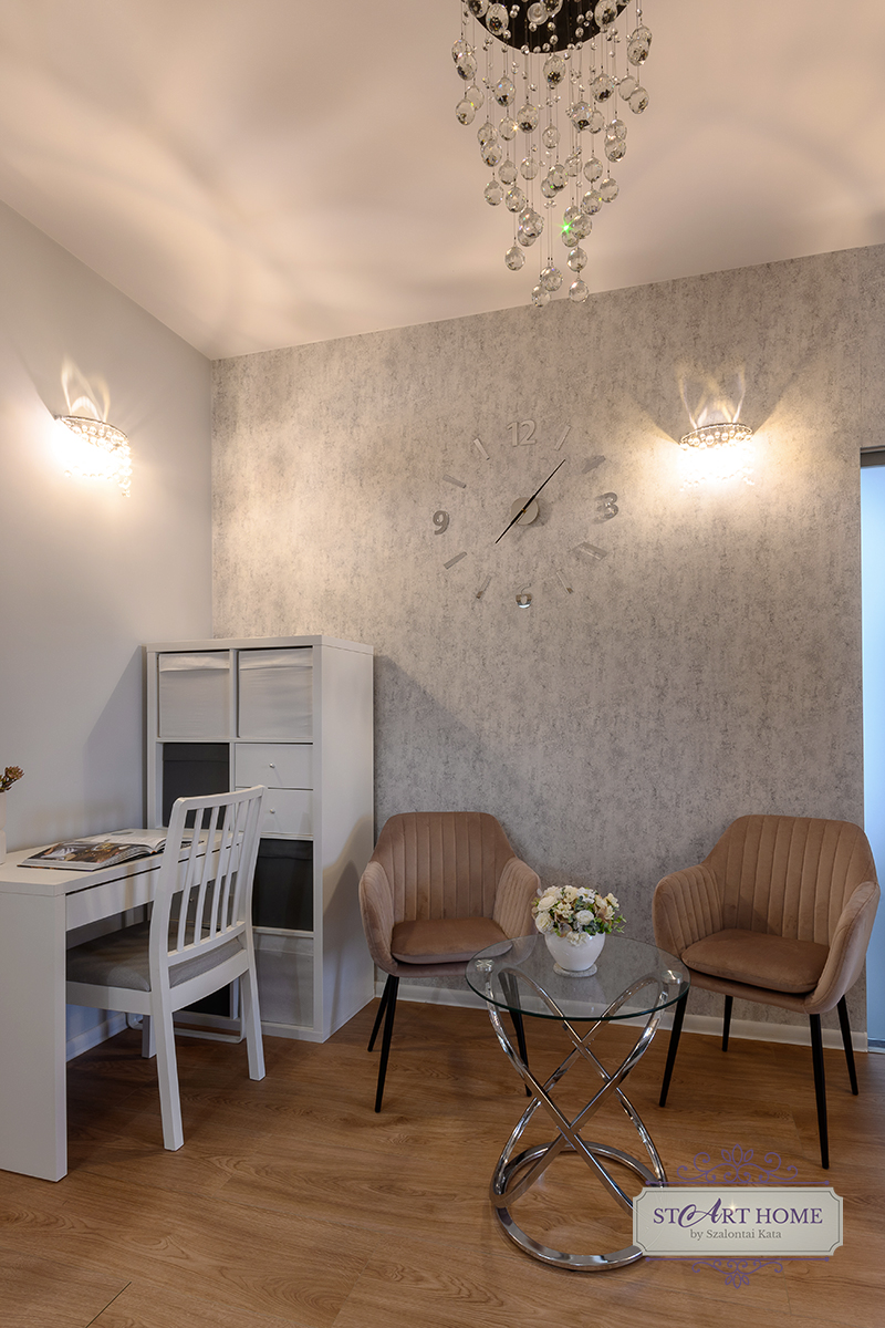 A teljes körű lakberendezés keretében Megbízómnak elkészítettem az új funkciókhoz, új kialakításokhoz illesztett teljes villanyszerelési tervet, gépészeti ajánlást, gipszkartonozási terveket – mennyezetre és válaszfalakra egyaránt. Építésszel, statikussal együttműködve terveztünk két helyen falnyílás bővítést. Kicserélésre kerültek a régi ablakok, ajtók, mindenhova új burkolatok kerültek, amik burkolatkiosztási terveit szintén szükséges volt elkészíteni.