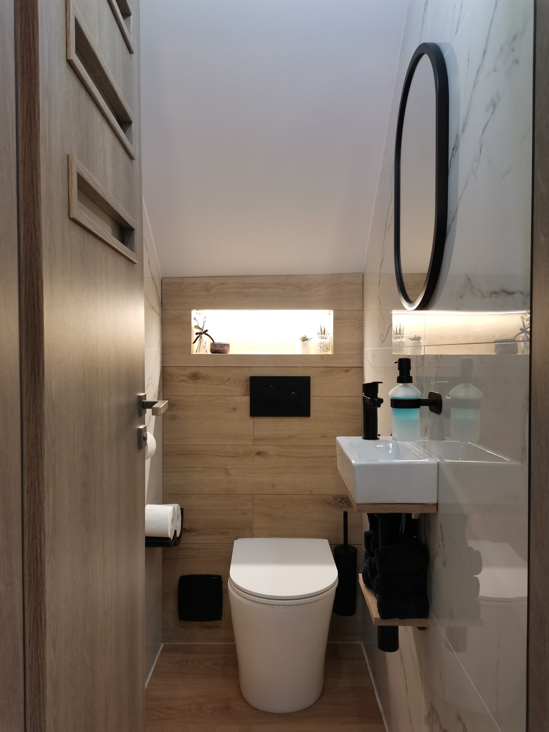 A fürdőszoba és toilette két kicsiny helyiség volt, ezért megtettem mindent, hogy a helykihasználás a legpraktikusabb legyen, a szükséges gépek szépen és praktikusan elférjenek, miközben az esztétikum igazi élményt nyújtson. A különleges ledes megvilágítások, ledes tükör, egyedi mennyezeti lámpák és függesztékek, az ez esetben is egyedileg tervezett és kivitelezett fürdőszobabútor tökéletes összhangot alkot és kiváló lehetőséget biztosít az ottlakók számára, hogy pihenhessenek ebben a helyiségben.