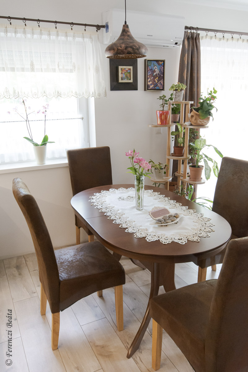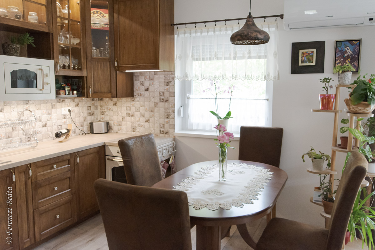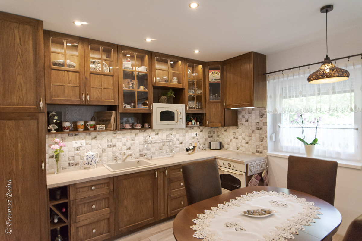 Az alap elképzelést a tulajdonos hölgy kiváló ízlése adta. A konyhabútort valódi fából álmodta meg meleg barna színben, vintage, kissé rusztikus stílusban. Mind a konyha, mind az étkező bútorai minőségi anyagokból készültek: az egyedi konyhabútor, az étkező asztala és székei valódi tölgyfából készültek, az étkező székek bőrülésesek, a konyhabútorba minőségi gránit mosogató, indukciós főzőlap és elektromos sütő került beépítésre.
