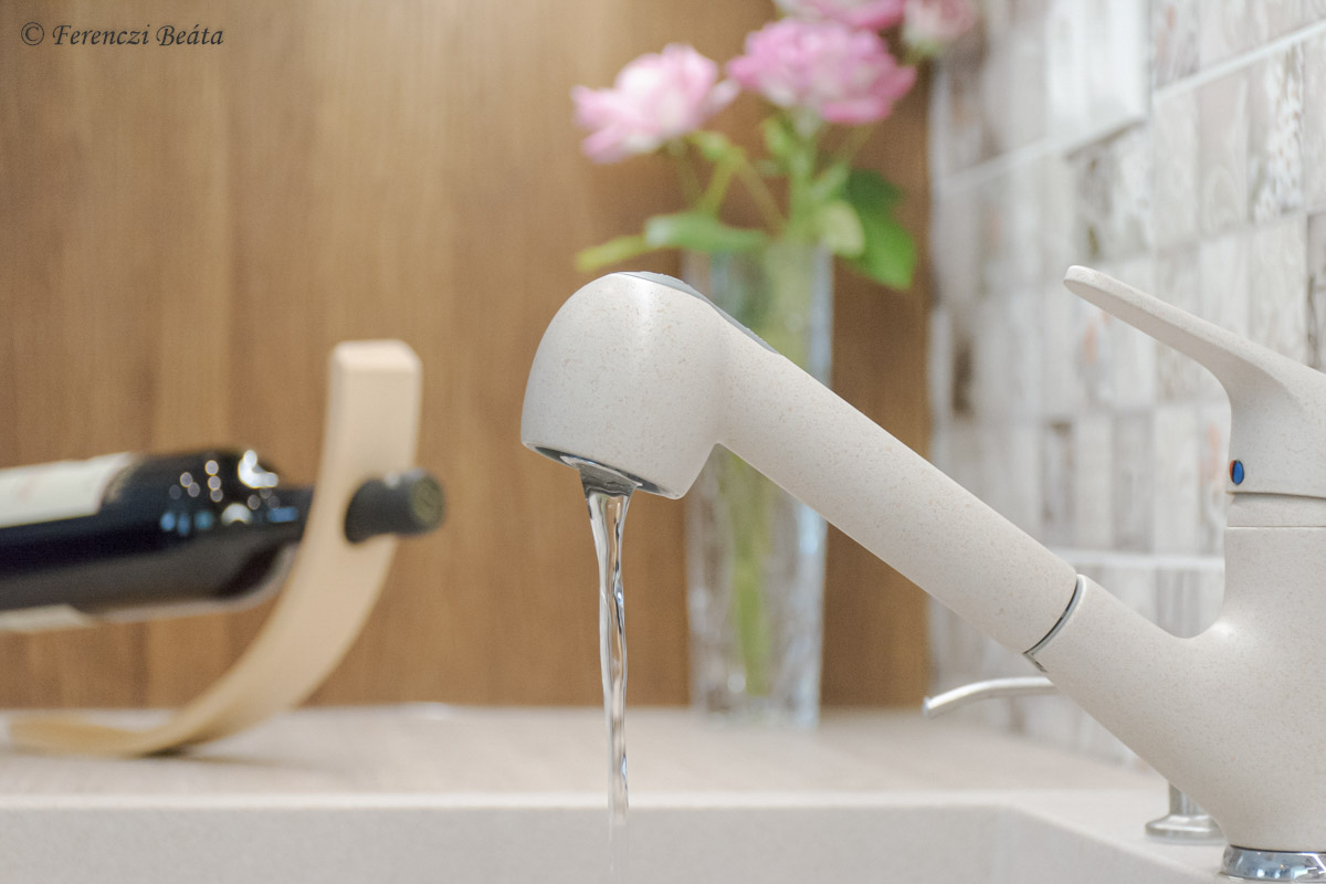 Az esztétikus kialakításra ügyeltünk az apróságok terén is, úgy, mint a bútor kerámiabetétes bronz fogantyúi, a bronz csaptelep, a konyhabútor üvegbetétei és tölgyfa osztásai, a bútor külső és belső megvilágításai, a spot lámpák bronz színű foglalatai és a sort még folytathatnám.