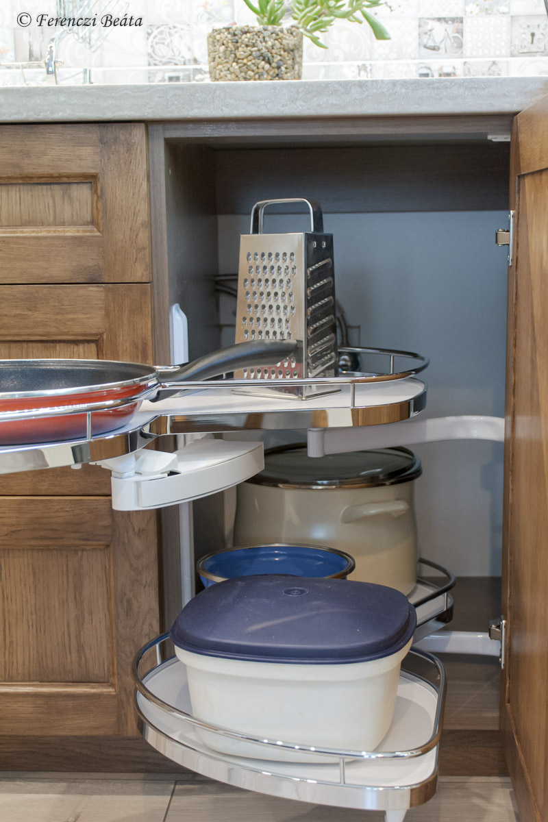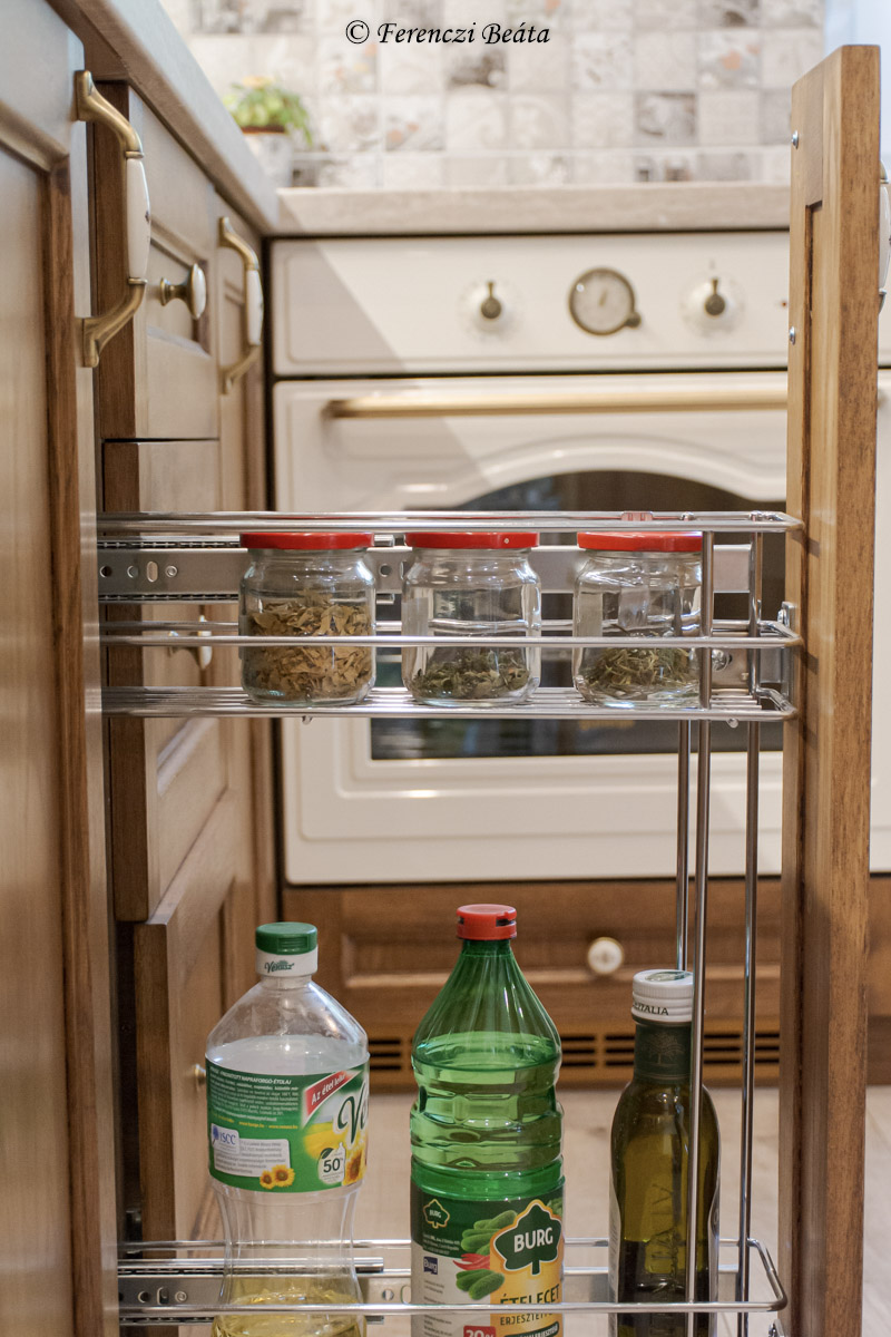 A konyhabútor egyedi elrendezését a megrendelővel folytatott sok-sok közös gondolkozás és ötletelés mentén terveztem. Cél volt a konyha számára rendelkezésre álló tér maximális és praktikus kihasználása, ötletes kialakítások betervezése, a tulajdonos hölgy konyha használati szokásainak, magasságának, már meglévő konyhai eszközeinek figyelembevétele, és közben az elképzelt stílushoz igazodó bútor kialakítása.